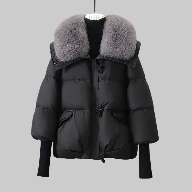 • Cuello de piel lujoso: Un suave y voluminoso cuello de piel sintética que te mantiene abrigada y le da a tu atuendo un toque de elegancia.