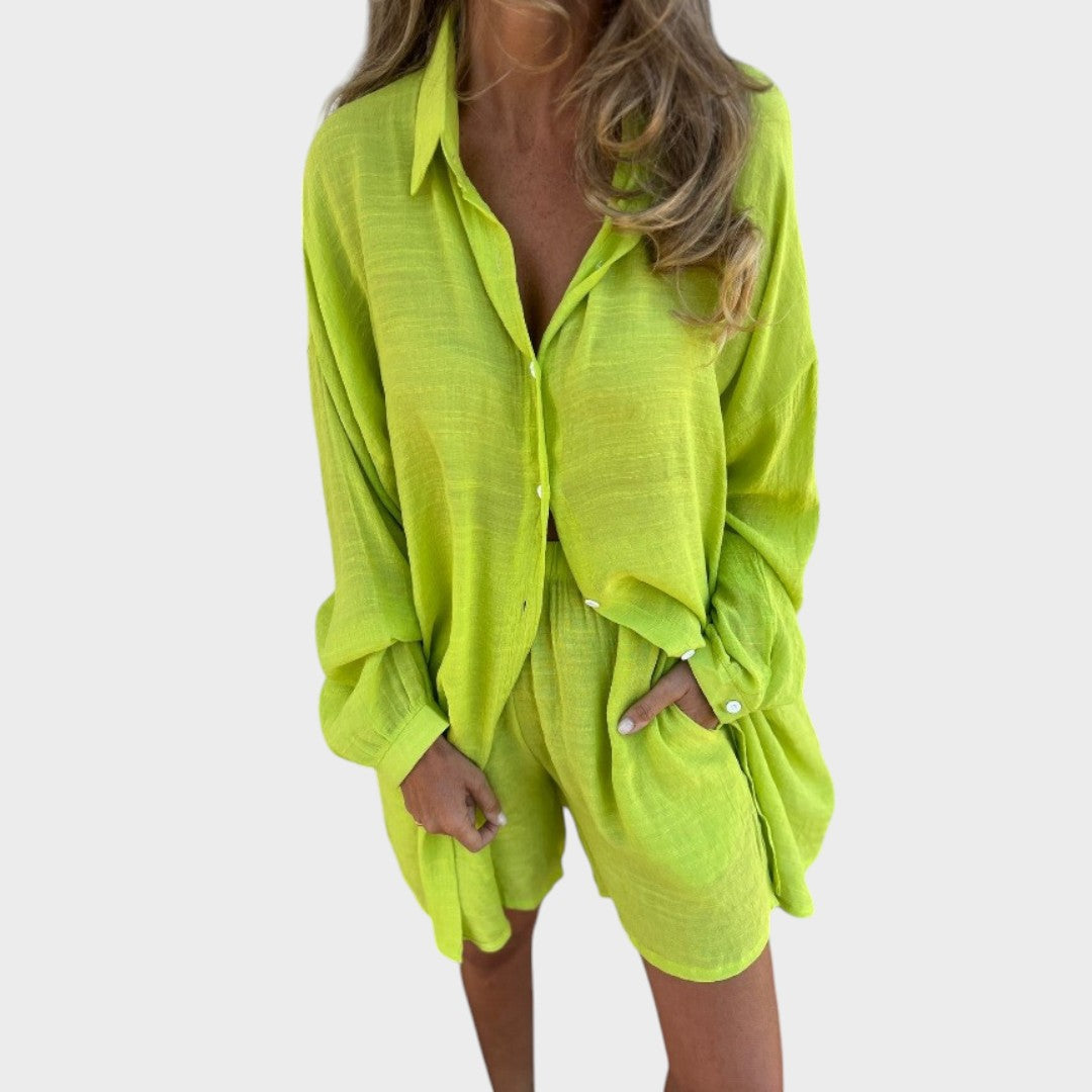 •   Casualmente elegante - Los pantalones cortos sueltos con la cintura elástica y la camisa arrugada crean un estilo que parece tan natural como moderno. Te ves bien sin intentarlo.