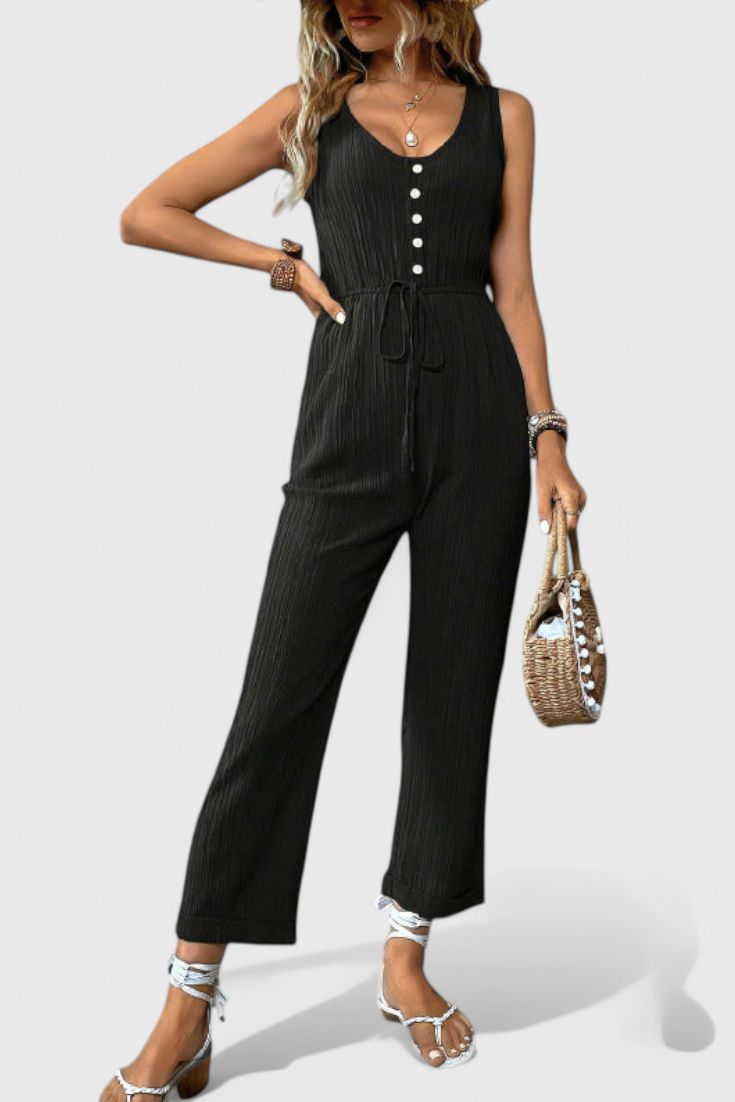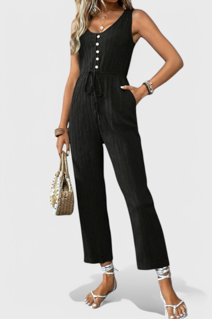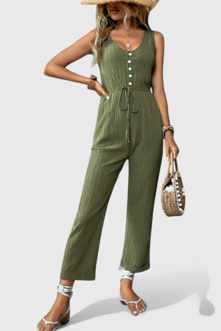 Pulido, transpirable y infinitamente versátil—Marisela es tu opción para una elegancia sin esfuerzo. Confeccionado en una mezcla de algodón texturizado, este mono sin mangas presenta un favorecedor escote en V, una cintura definida con cinturón y una silueta recta y limpia. Ya sea que salgas a un brunch o te vistas para una soirée de verano, ofrece comodidad con sofisticación moderna.