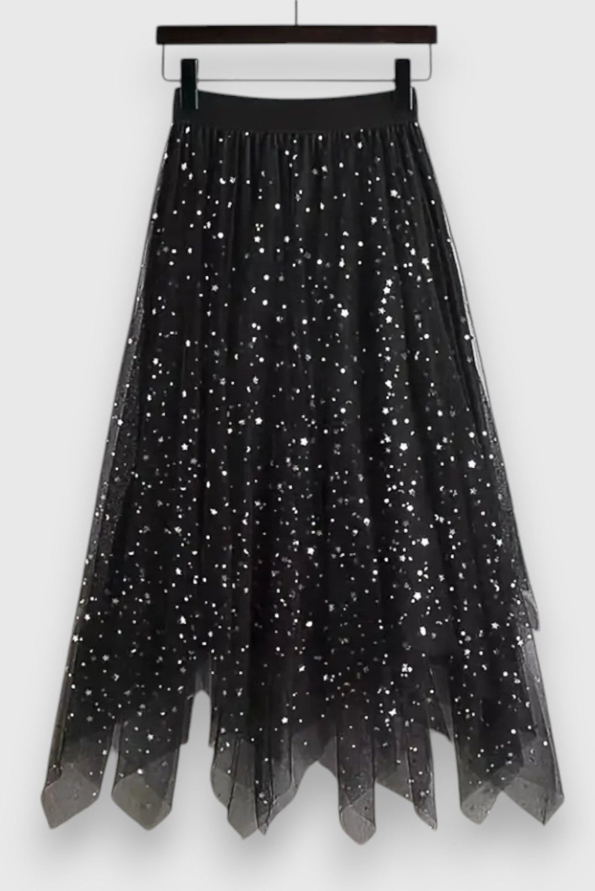 Sofisticación con un destello audaz. La falda Colette destaca por su corte favorecedor y detalles brillantes que elevan cualquier conjunto. Su dobladillo fruncido añade movimiento, mientras las lentejuelas crean un contraste encantador y femenino. Una prenda versátil que combina glamour con estilo diario.
